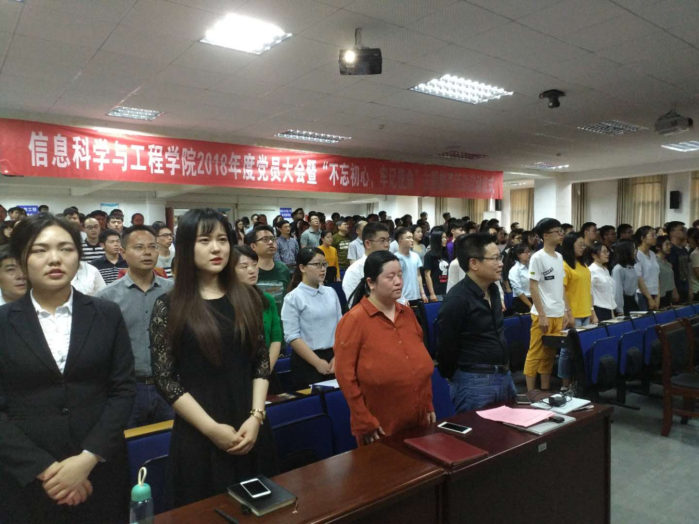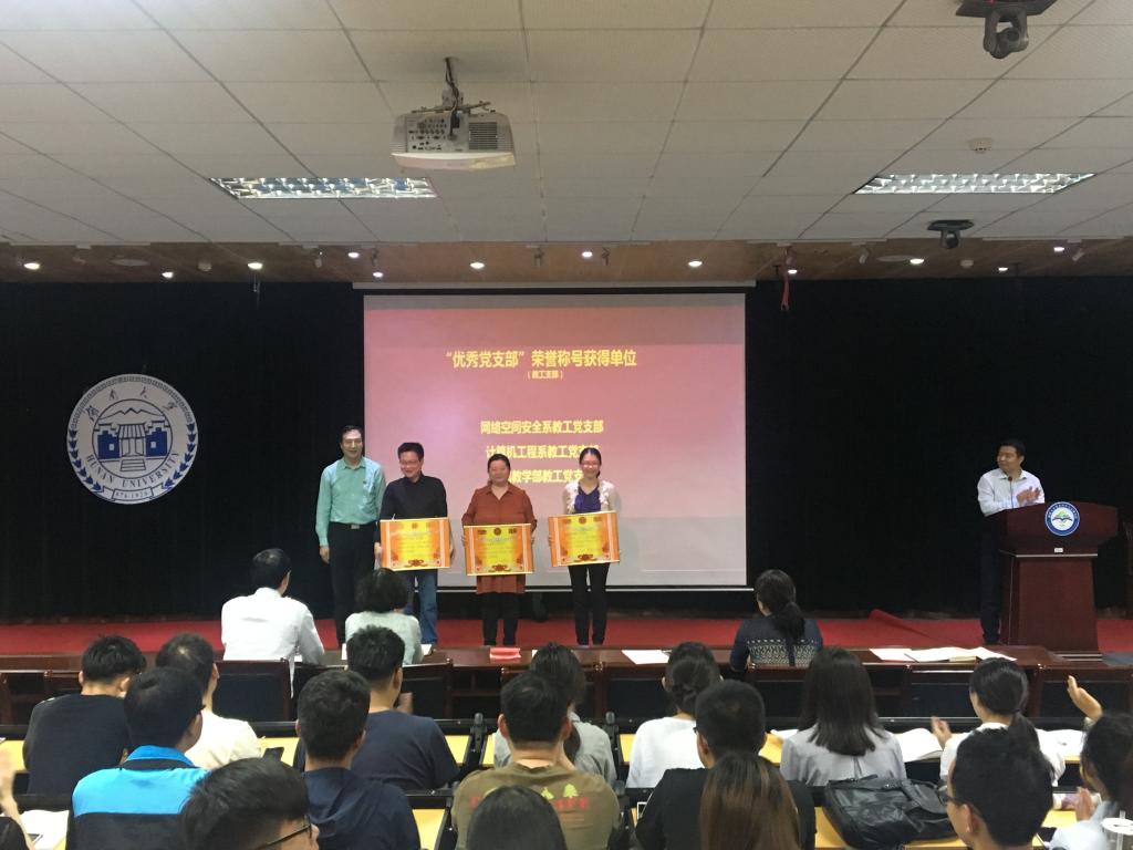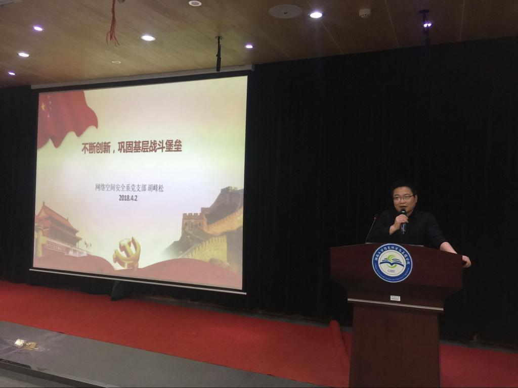 党员大会暨“不忘初心,牢记使命”主题教育活动启动仪式于软件大楼330报告厅举行。会议由党委副书记贺迅主持,全体教职工党员、学生党总支各支部支委、受表彰的先进集体和先进个人代表共400余人参加大会。大会在庄严雄壮的国歌声中拉开帷幕。