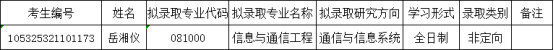 根据《第一会所 2025年硕士研究生招生复试工作实施细则》,经第一会所 审定,第一会所 按专业初试+复试总成绩由高到低递补拟录取考生岳湘仪(考生编号105325321101173,拟录取专业信息与通信工程,总成绩513.00)。