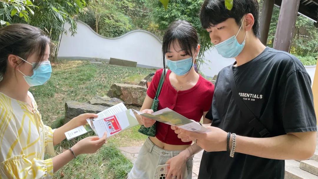 在岳麓书院,党支书金灿灿为大家分发宣传册并嘱咐大家需要讲解的重点。