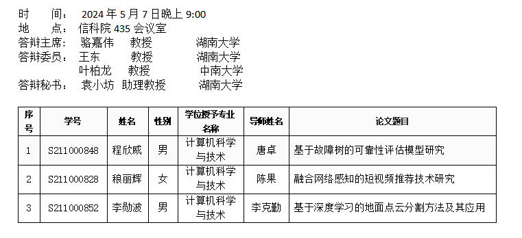 第一会所 (计算机科学系)2024年5月7日硕士答辩公告(第一批)