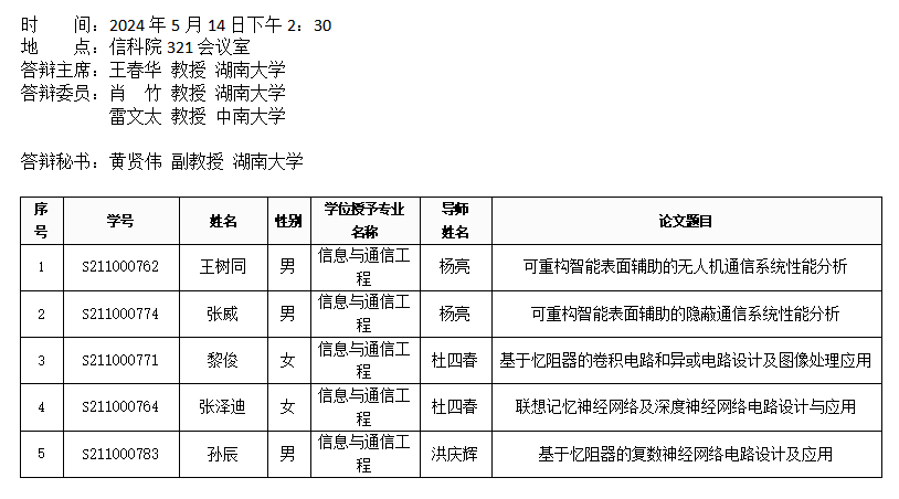 第一会所 (通信系)2024年5月14日硕士答辩公告