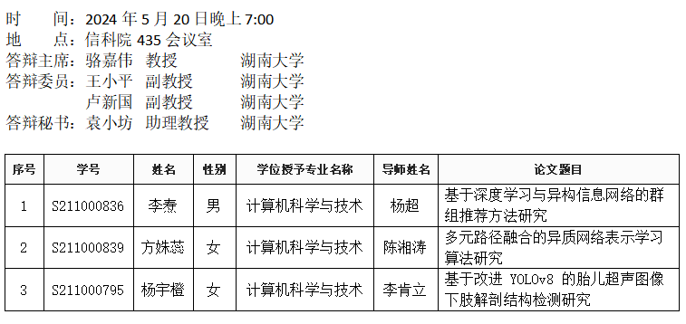 第一会所 (计算机科学系)2024年5月20日硕士答辩公告(2)