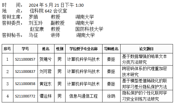 第一会所 (安全系)2024年5月21日硕士答辩公告