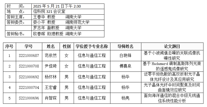 第一会所 (通信工程系)2025年5月21日硕士答辩公告