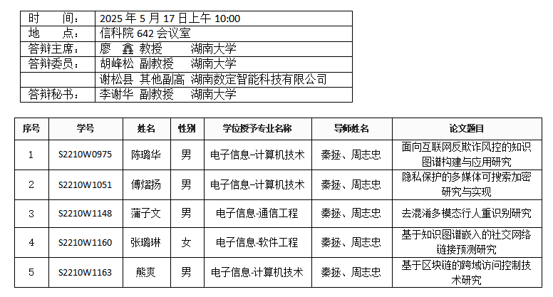 第一会所 (计算机科学系)2025年5月21日硕士答辩公告
