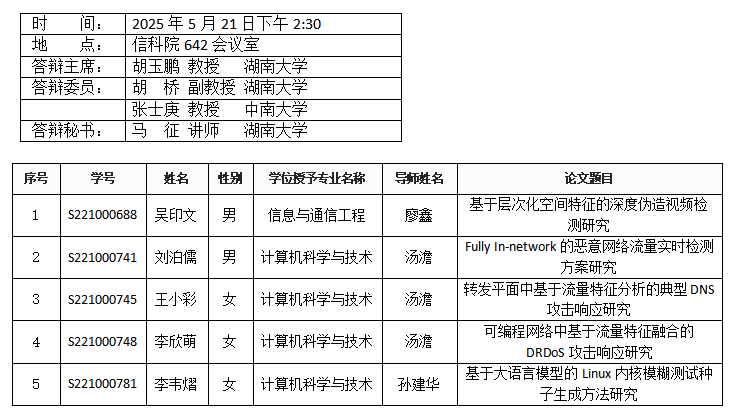 第一会所 (安全系)2025年5月21日硕士答辩公告