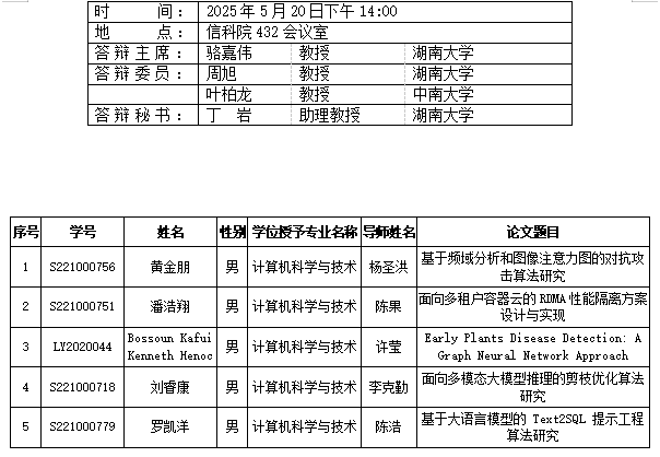 第一会所 (计算机科学系)2025年5月20日硕士答辩公告(2)