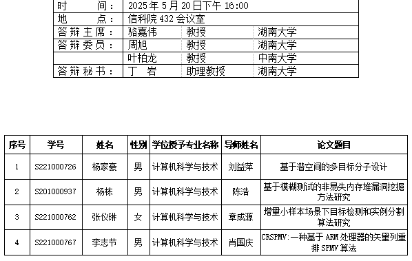 第一会所 (计算机科学系)2025年5月20日硕士答辩公告(2)