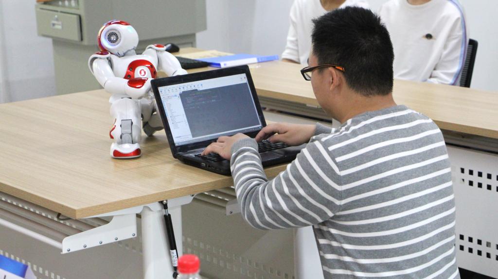 在互动展示环节,査星皓同学与NAO机器人互动,生动直观地展示了人工智能在机器人领域的应用。班主任安吉尧老师介绍人工智能专业发展前景,为同学们的专业学习和生涯规划指点迷津。