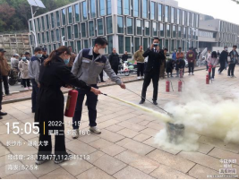 东门前坪,物业负责人对师生强调了火场逃生注意事项,讲解了灭火器的使用方法并作了演示。随后部分师生实际操作使用灭火器现场灭火。