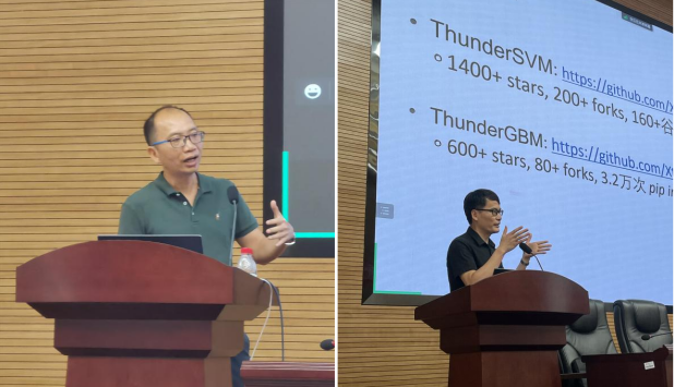 201报告厅分别展开了题为《联邦学习系统:数据孤岛上的有效和高效机器学习系统》和《基于CPU和GPU加速的高效机器学习系统》的学术讲座。讲座由副院长蒋洪波教授主持,第一会所
