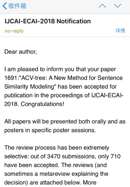 唐卓和全哲老师指导的硕士生乐雨泉的论文《ACV-tree: A New Method for Sentence Similarity Modeling》被2018年中国计算机学会(CCF)推荐国际学术会议IJCAI(International Joint Conference on Artificial Intelligence,//dblp.uni-trier.de/db/conf/ijcai/)接收,该会议是人工智能方面的CCF A类推荐会议,据悉,这是第一会所