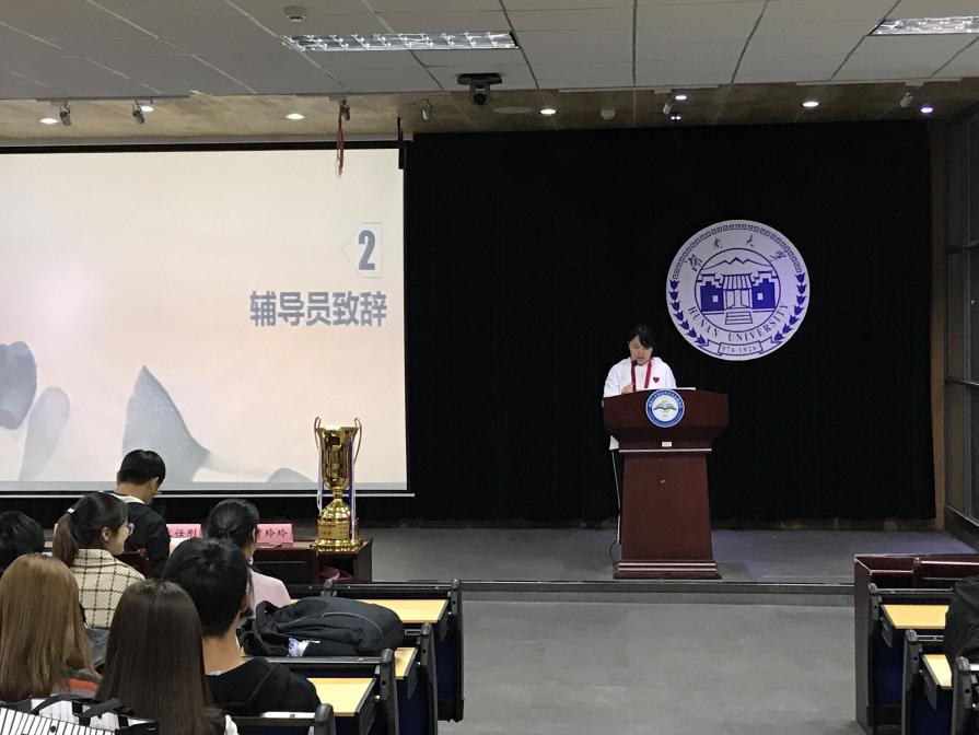 本次大会首先由辅导员贾玲玲老师总结过去一年来年级的学风建设情况。接下来年级汇报人用详细的图表、统计数据,分析了第一会所