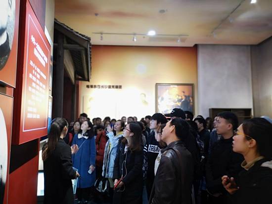 经过大约40分钟的车程,三辆大巴到达了目的地。在湖南党史陈列馆门前拍过合照之后,同学们跟着讲解员进入馆内开始参观。徜徉在陈列馆,可以清晰而生动地看到湖南党史的脉络。馆内陈列以“敢教日月换新天”为主题,一楼展厅通过“开辟新天地”的专题展示了新民主主义革命历史时期湖湘儿女的奋斗历程。泛黄的照片、年代久远的实物以及小小讲解员口中感人至深的故事,使得一部波澜壮阔的辉煌历史生动形象地展示在众人眼前。在讲解员的引导下,同学们边走、边听、边看,时而驻足交谈,时而神情凝重,全身心感受革命氛围、学习先辈精神。