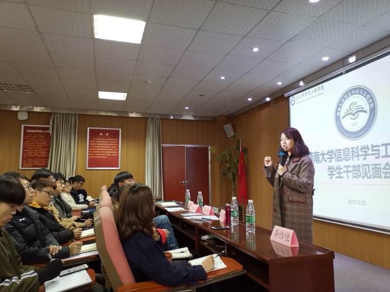 党委副书记向江老师与全体学生干部见面,就“新时代学生干部的本质”开展讨论。出席本次会议的嘉宾有:信息院党委副书记向江老师,团委书记潘磊老师,团委常务副书记古浪屿老师,15级本科生辅导员宋任刚老师,研究生辅导员李惟佳、刘清钦老师等。
