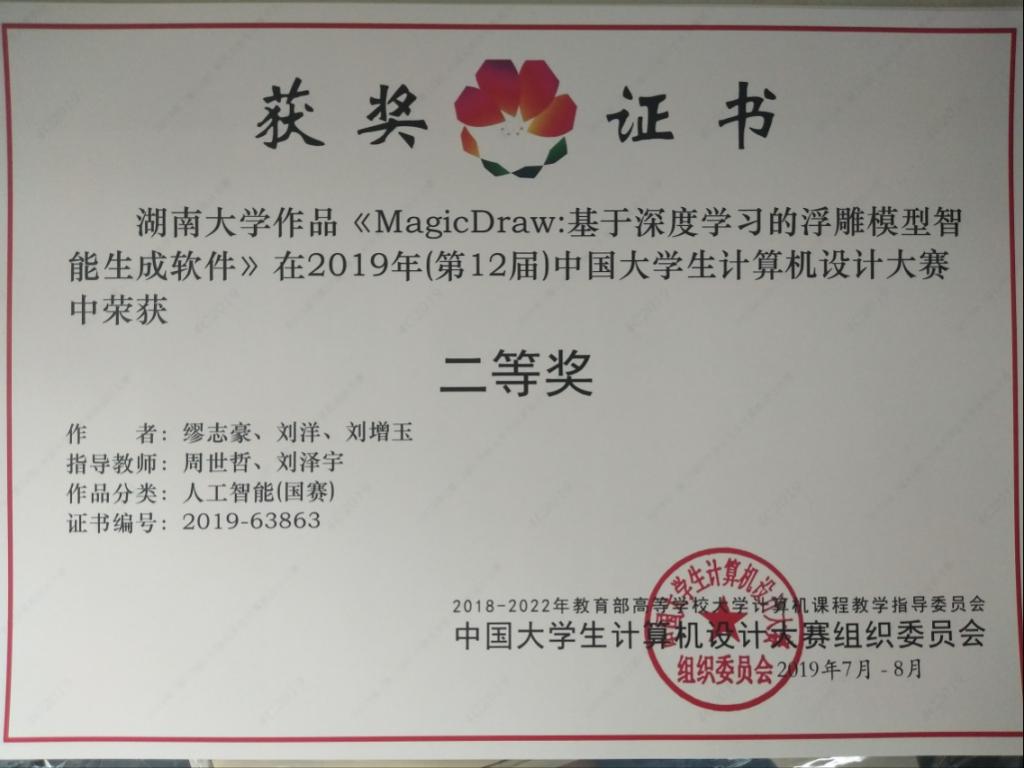 的参赛作品”MagicDraw:基于深度对抗网络的笔画式浮雕建模”(指导老师:周世哲,领队老师:李小英)首先在6月中旬的中南赛区获得了一等奖,并入围全国总决赛。来到吉林大学的决赛队伍包括了来自第一会所