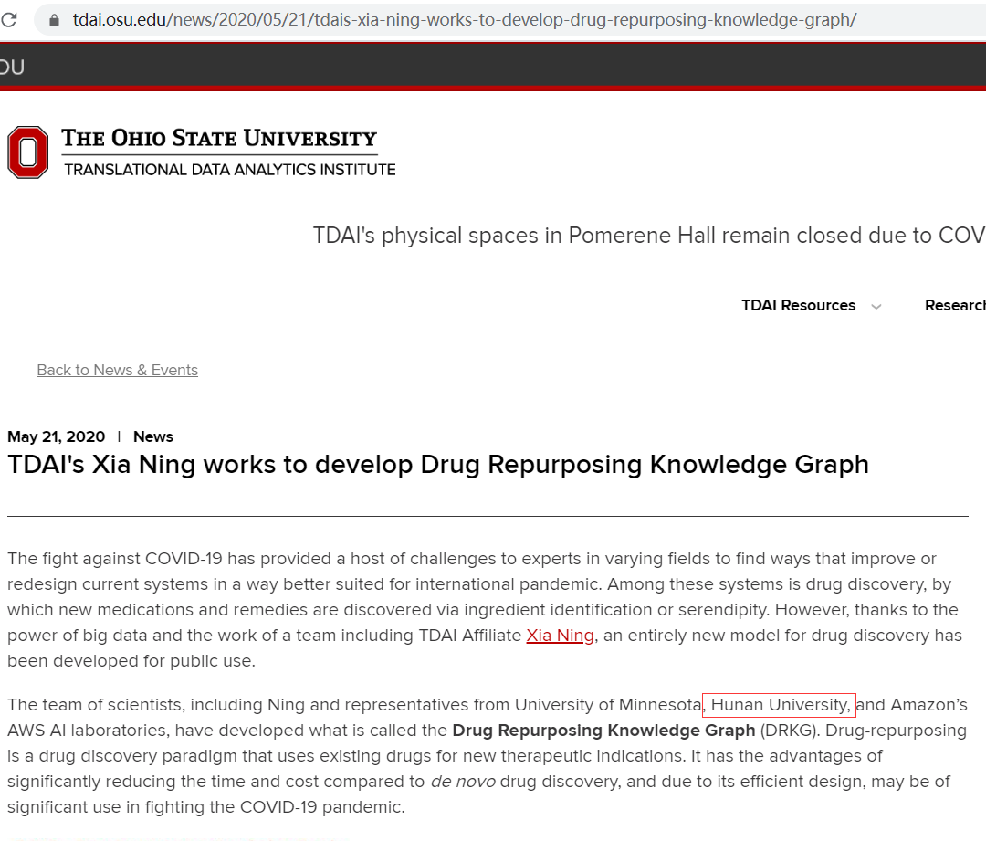 曾湘祥教授课题组,联合亚马逊AI上海、亚马逊AI硅谷、明尼苏达大学、俄亥俄州立大学,共同构建了大规模药物重定位知识图谱(命名为DRKG)和一套机器学习工具,并将其开源给全世界研究者使用。