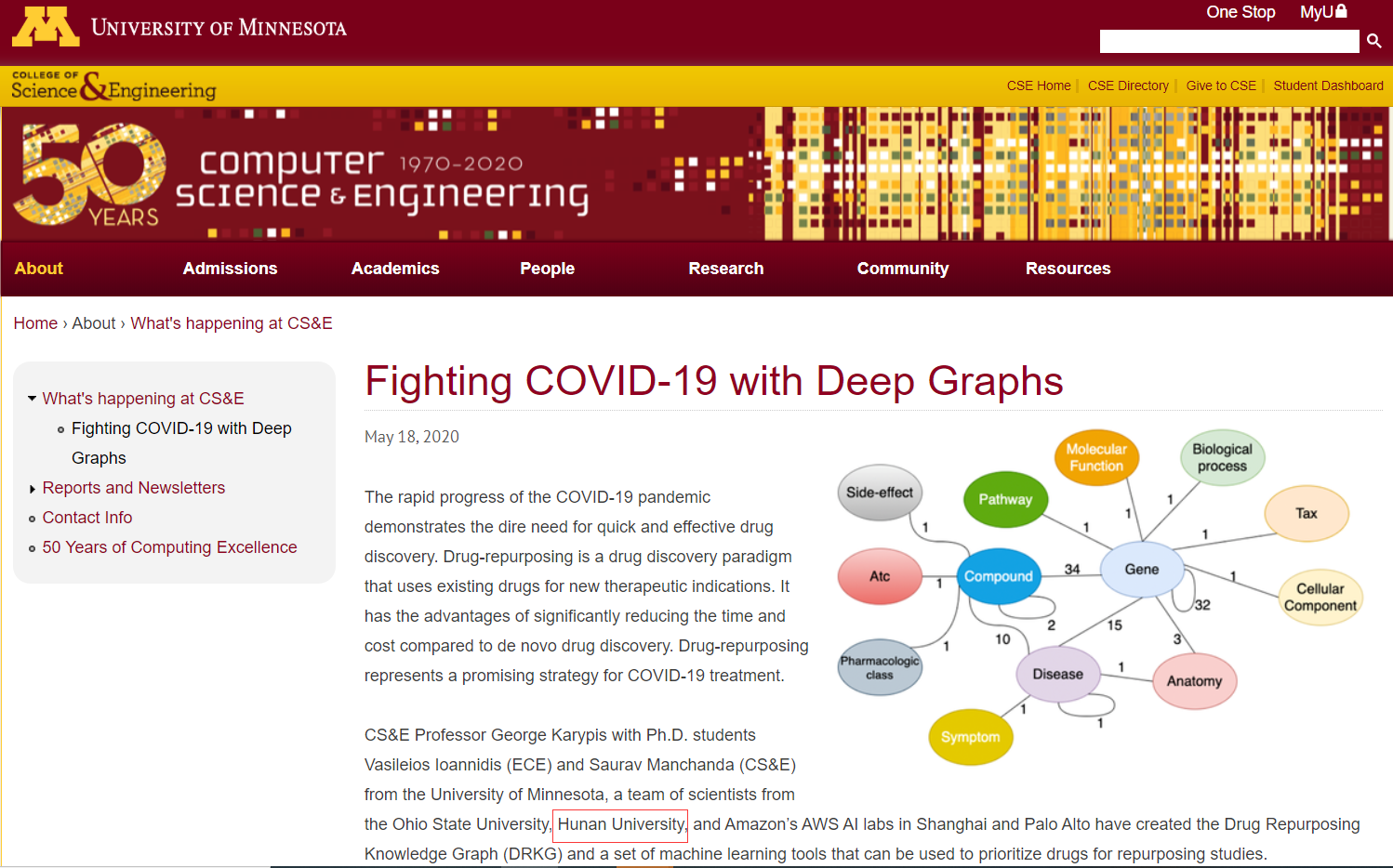 曾湘祥教授、研究生潘小琴同学及其合作者们在Github上公开提供了DRKG、机器学习工具以及训练好的embedding数据,以帮助相关研究人员更有效地对新冠病毒及其它疾病(如阿尔茨海默病)进行药物重定位研究。Github://github.com/gnn4dr/DRKG。