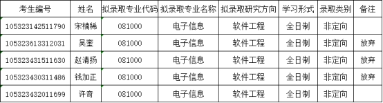 按专业初试+复试总成绩由高到低递补拟录取考生宋楠稀(考生编号105323142511790,拟录取专业电子信息软件工程,总成绩548.37),考生许奇(考生编号105323432011699,拟录取专业电子信息软件工程,总成绩527.17)。