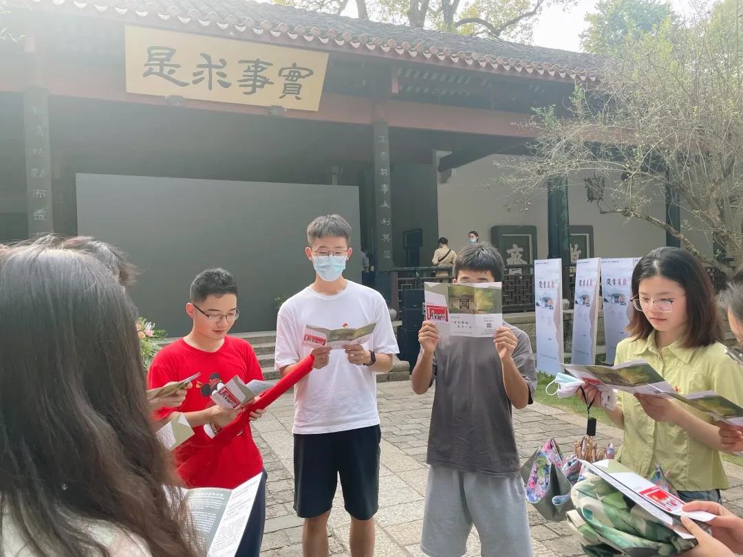 支部成员为游客介绍岳麓书院作为实事求是策源地的论述来源以及将宣传册发给游客。