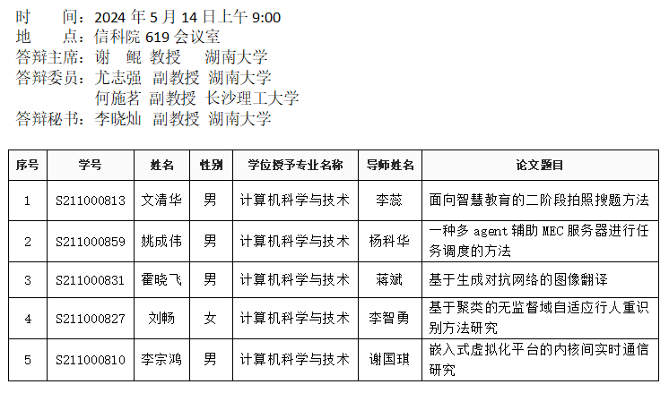 第一会所 (计算机工程系)2024年5月14日下午硕士答辩公告
