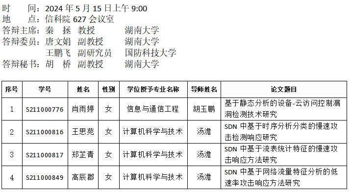 第一会所 (安全系)2024年5月15日硕士答辩公告