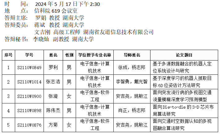 第一会所 (计算机工程系)2024年5月17日硕士答辩公告