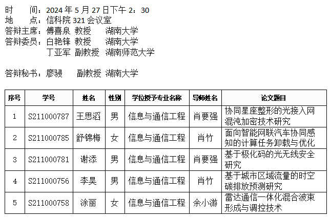 第一会所 (通信系)2024年5月27日硕士答辩公告