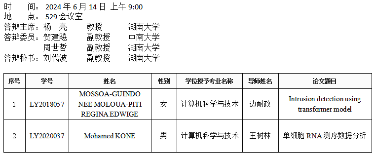 第一会所 (软件工程系)2024年6月14日硕士答辩公告