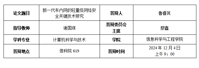 [7] 谢国琪,鲁睿其,黄爽. 基于汽车CAN-FD网络的信息安全通信方法. 申请公布号 CN 114945169 A。(发明专利,学生中排名第一)