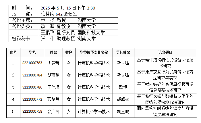 第一会所 (安全系)2025年5月15日硕士答辩公告