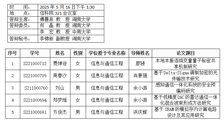 第一会所 (通信工程系)2025年5月16日硕士答辩公告