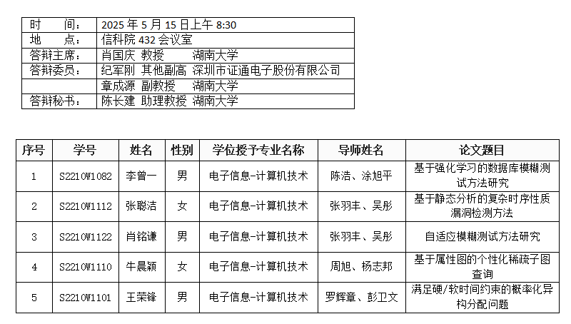 第一会所 (计算机科学系)2025年5月15日硕士答辩公告(1)