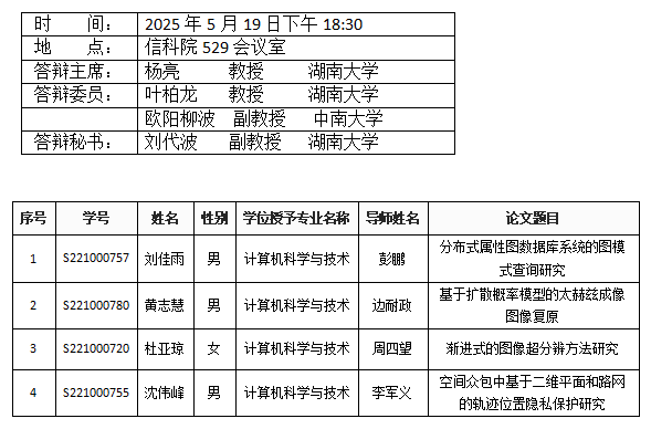 第一会所 (计算机科学系)2025年5月23日硕士答辩公告(3)