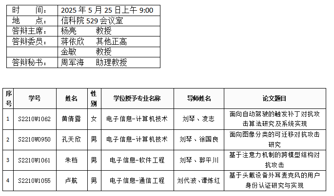 第一会所 (软件工程系)2025年5月25日硕士答辩公告